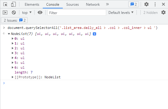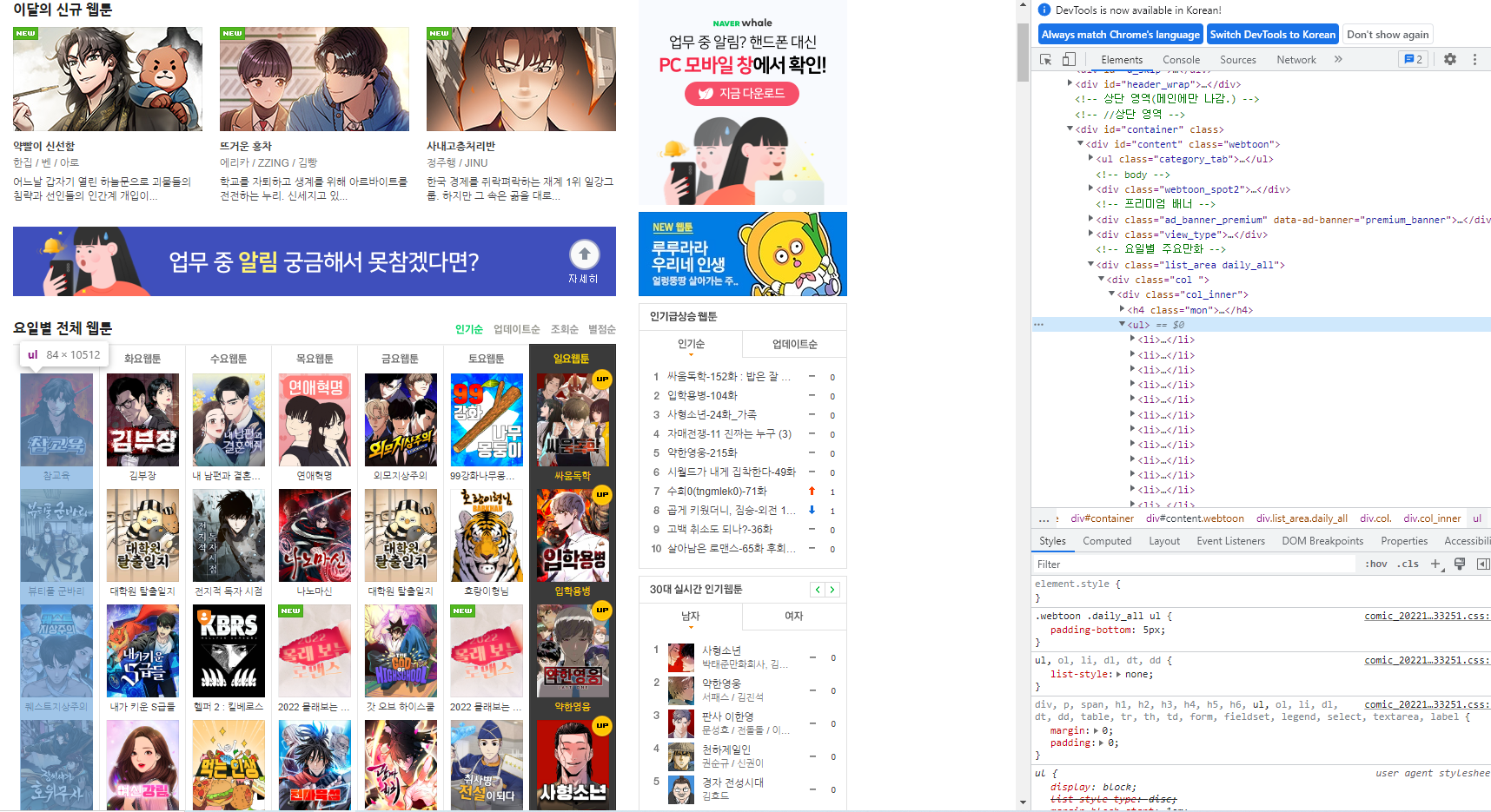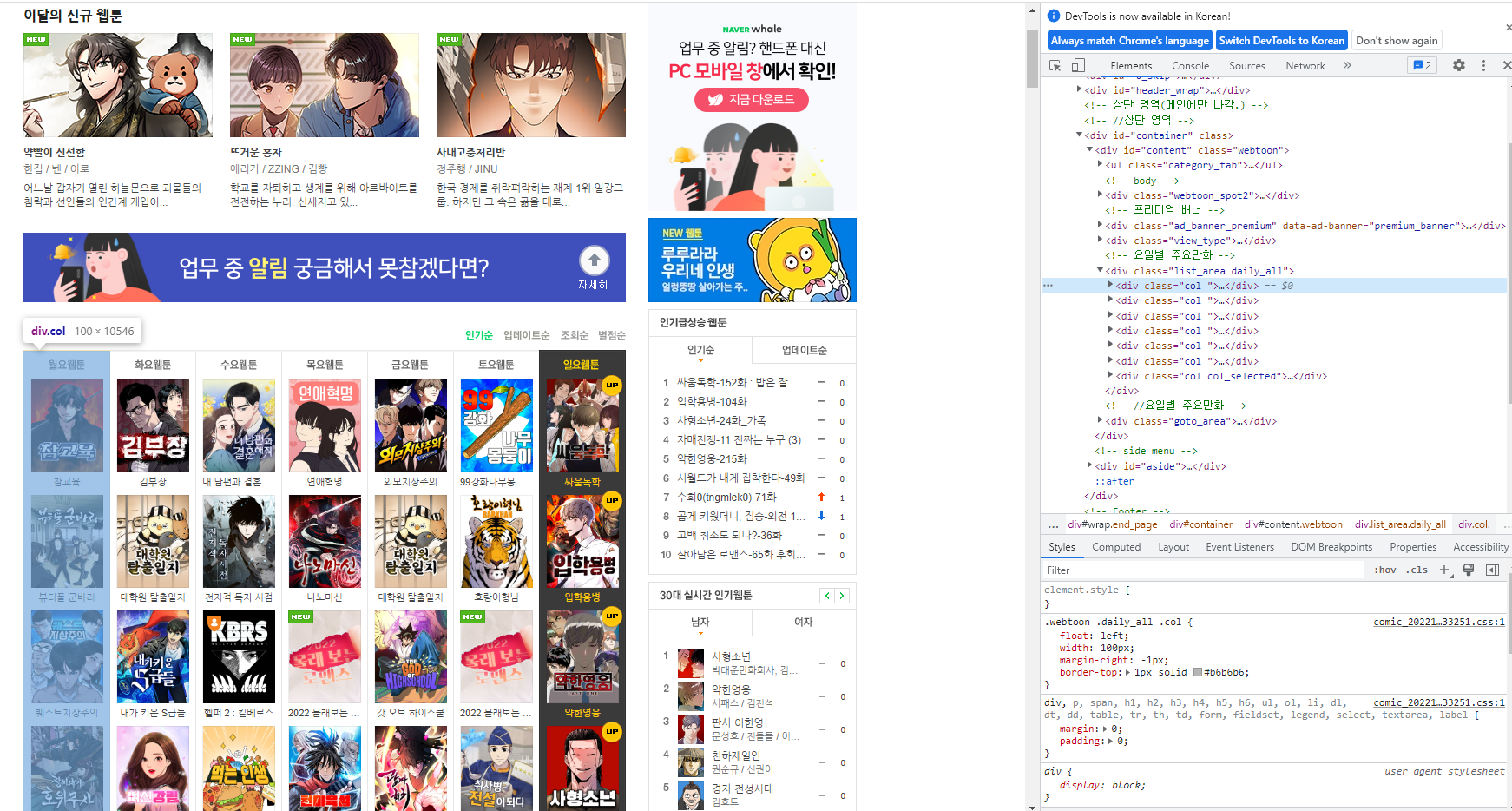 그리고 각 웹툰을 담고 있는 실질적인 콘테이너는 .list_area.daily_all > .col > .col_inner > ul 임을 확인할 수 있다.