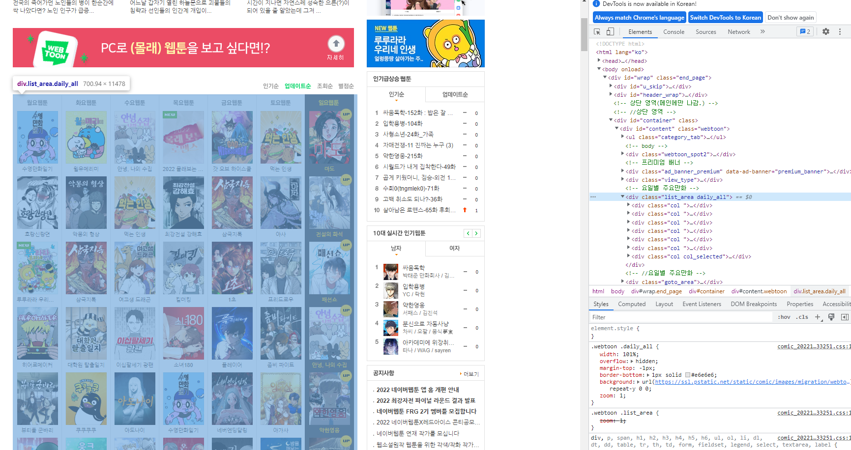 css선택자로 .list_area.daily_all 해당하는 위치에 웹툰 목록이 위치해있다.